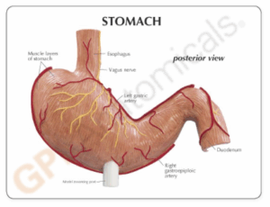 El modelo presenta las capas de la pared del estómago desde la cardia hasta el píloro. La mitad delantera del estómago se puede retirar. Se presentan: