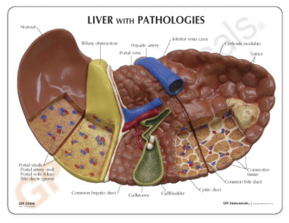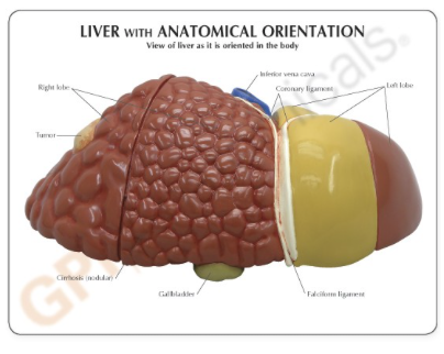 Modelo de hígado de tamaño real con las siguientes patologías comunes; cirrosis (septal y nodular), obstrucción biliar, cálculos biliares y tumores.