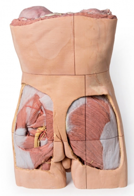 Este modelo ilustra tanto los músculos superficiales como profundos, ocho de los cuales son desmontables. Los tendones, vasos sanguíneos, nervios y componentes óseos de la pierna y el pie izquierdos aparecen con gran detalle. Las partes vienen enumeradas. Sobre soporte desmontable.
